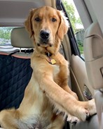 He loves engaging with other dogs and people — almost too much! He goes to grandma and grandpa’s regularly to visit and loves their dogs! We take Izzy and our other Golden, Benny, on walks occasionally. But they prefer dog parks and hiking in the woods where they can be off leash! He is the mediator at the dog park — never in the middle of the pack, but always looking in! Sometimes he gets a little jealous when mom’s attention is with the other pups. Izzy is very obedient and will not stray too far from his mom. He loves to run, run, run! We are taking our first vacation with the dogs in just a few weeks—-heading to South Carolina!